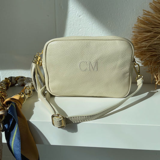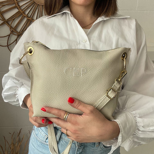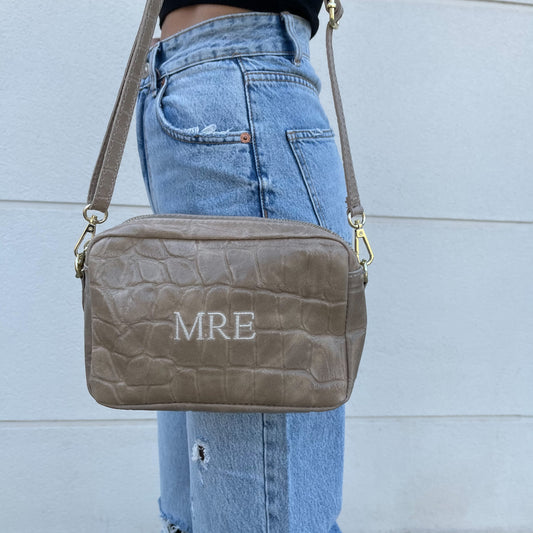 Bolso coco personalizado con iniciales bordadas. Taupe